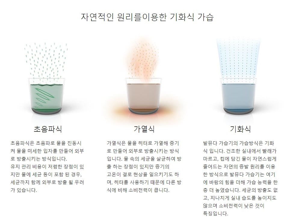 - ✅ 기화식: 순수한 수분만 증발 → 세균 확산 위험 최소화