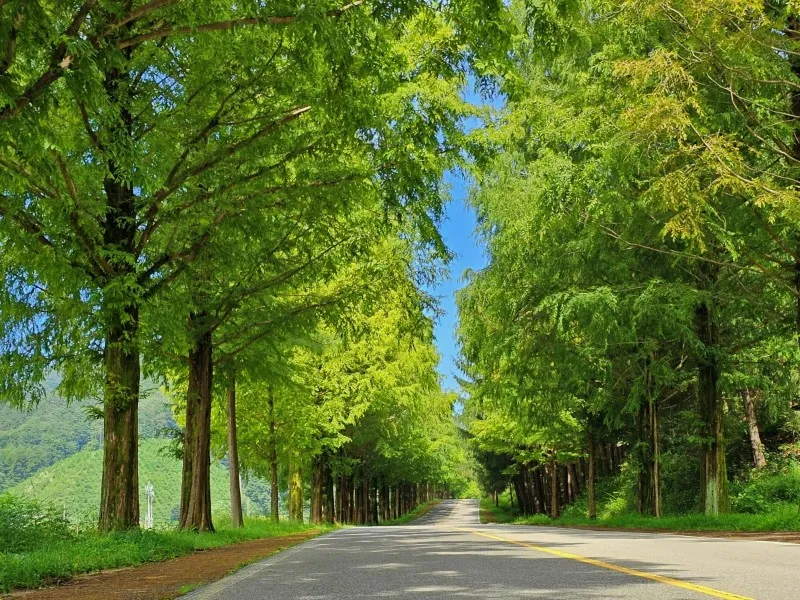 약 1.6km에 걸쳐 아름드리 메타세콰이어가 질서정연하게 늘어선 이 길은, 마치 영화 속을 걷는 듯한 특별한 경험을 선사합니다. 가을이면 붉고 노랗게 물든 나무들이 만들어내는 장대한 풍경은 드라이브와 산책 모두 즐기기 좋은 명소입니다.
