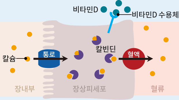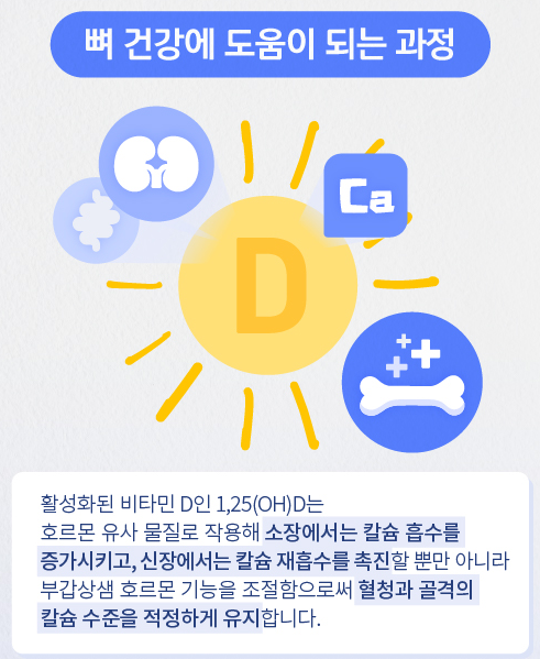 대부분 사람들이 뼈 건강하면 칼슘을 떠올리지만, 사실 칼슘만으로는 뼈를 만들 수 없습니다. 비타민D가 있어야 칼슘이 장에서 흡수되고, 흡수된 칼슘이 뼈로 이동할 수 있습니다.
