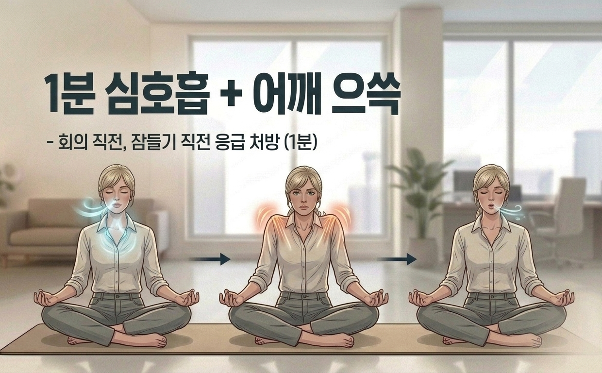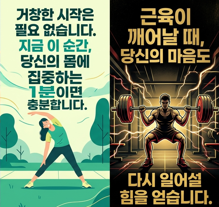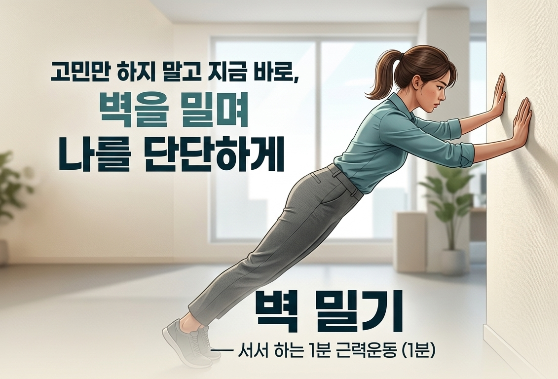 무거운 중량을 들어 올리는 것만이 운동이 아닙니다. 어깨를 으쓱 올렸다 내리는 1분, 벽을 밀어보는 1분, 숨을 깊이 들이쉬고 내쉬는 1분. 이 작은 움직임이 뭉친 근육을 풀어주고, 몸의 긴장을 해소하며, 감정의 폭풍을 잠재우고 이성을 깨우는 행위가 됩니다.